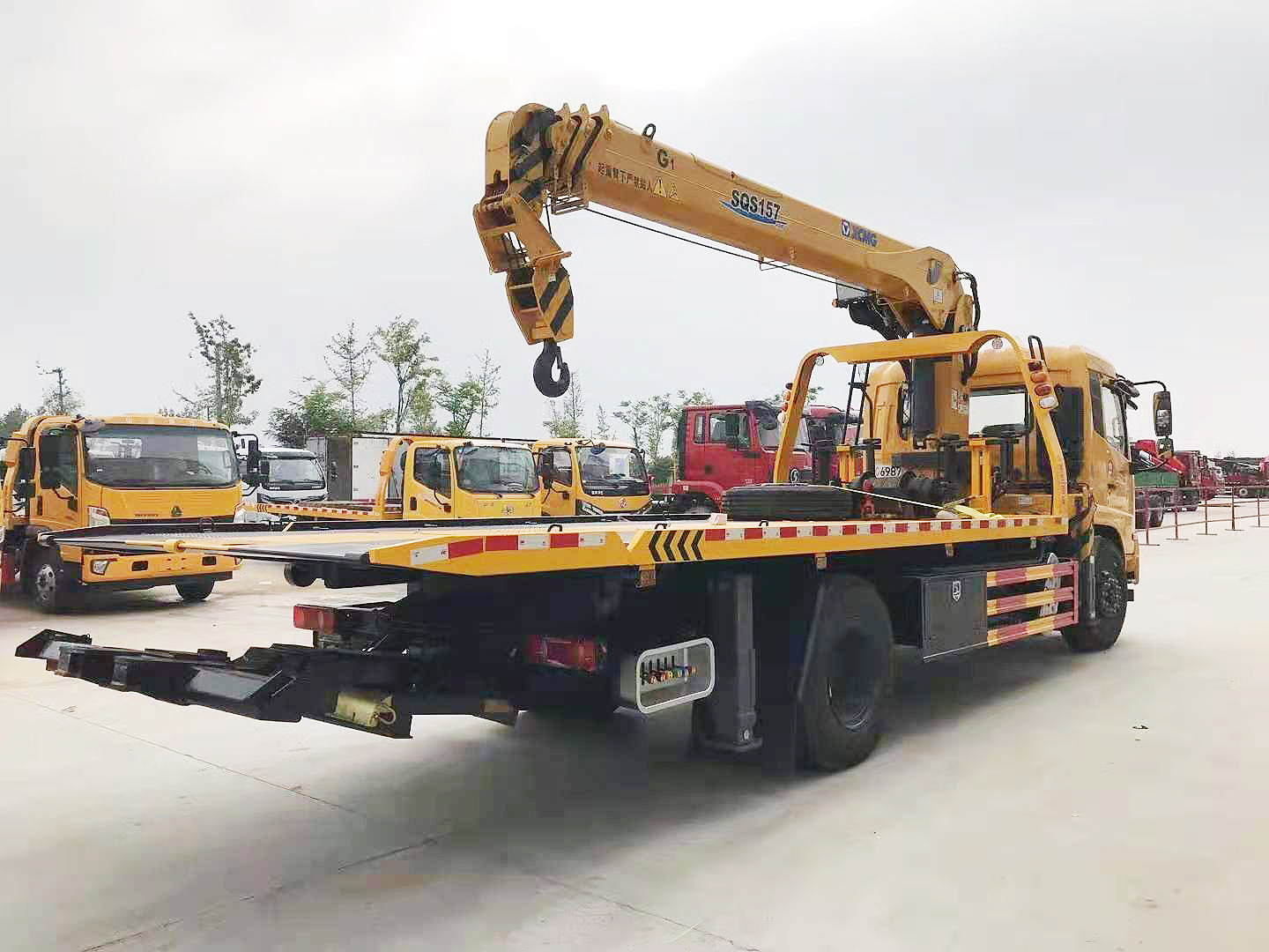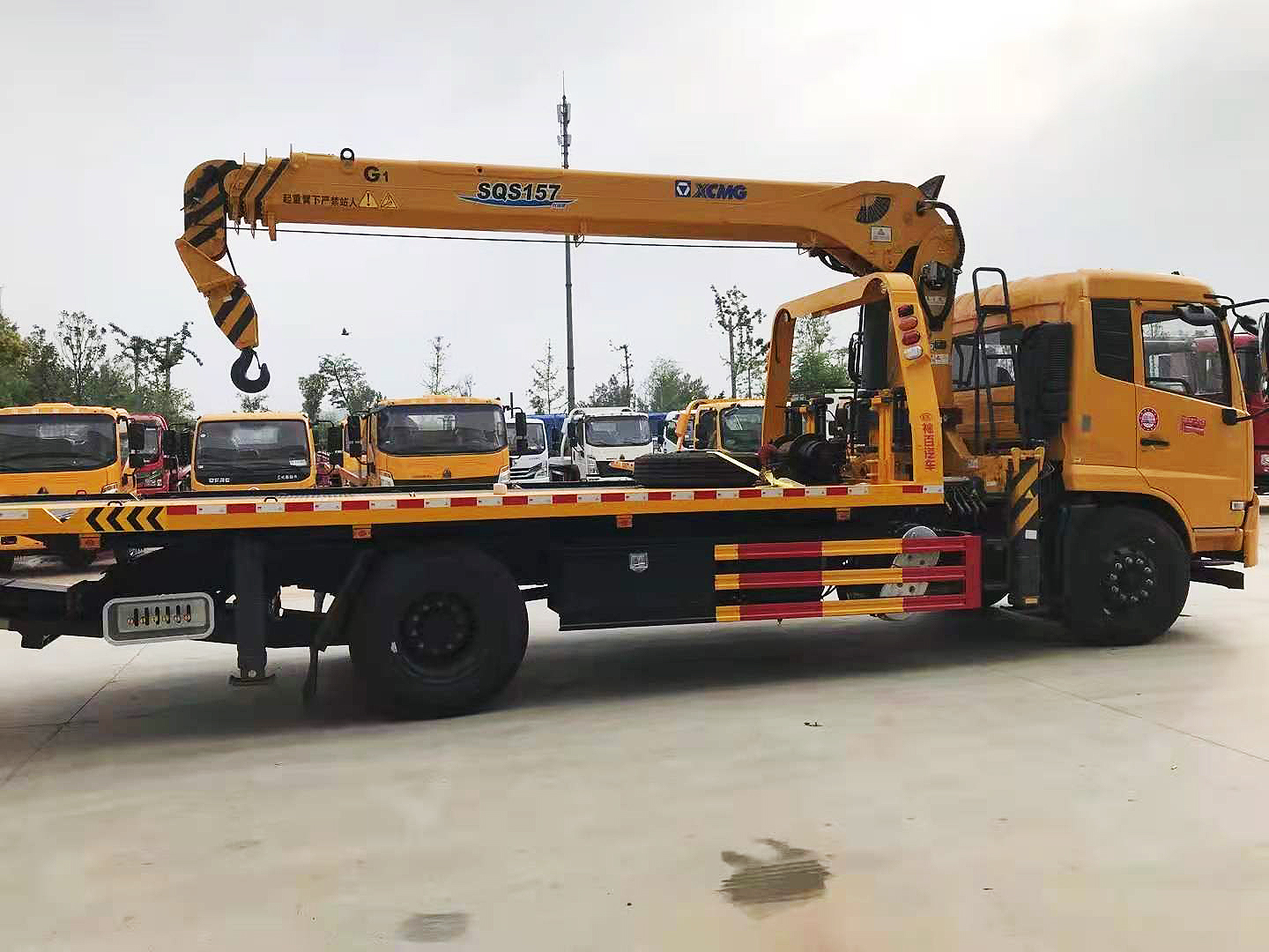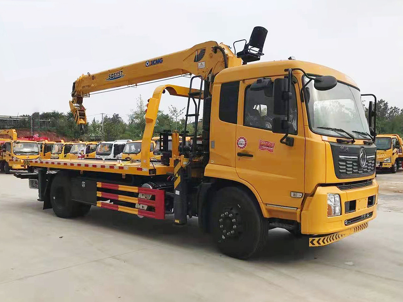 專用功能配置:上裝采用 6mm 高強度花紋板制作,(防滑能力強,承載能力高,外表美觀),該車平板總長度為 6.5米(含尾部板長 1.1 米),寬 2.55 米,平板承載質(zhì)量為 10噸。采用嘉善取力器,長源泵、意大利海德閥 加兩個平衡閥,液壓油管采用耐壓雙層鋼絲油管,抗壓力達到 18 兆帕,1 個工具箱,配兩個小車(**輪),4 根捆綁帶,L 型抱胎架一對,托叉一對,托叉座一對,鏈鉤一條,后工作燈 2 只,1 個 10噸液壓絞盤(30米鋼絲繩), 10噸三節(jié)臂后拖舉.